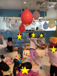 風船の鬼に豆に見立てたボールを当てるゲームを楽しみました。