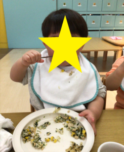 給食では、お祝いメニューの3色そぼろ丼をモリモリ食べていました♡